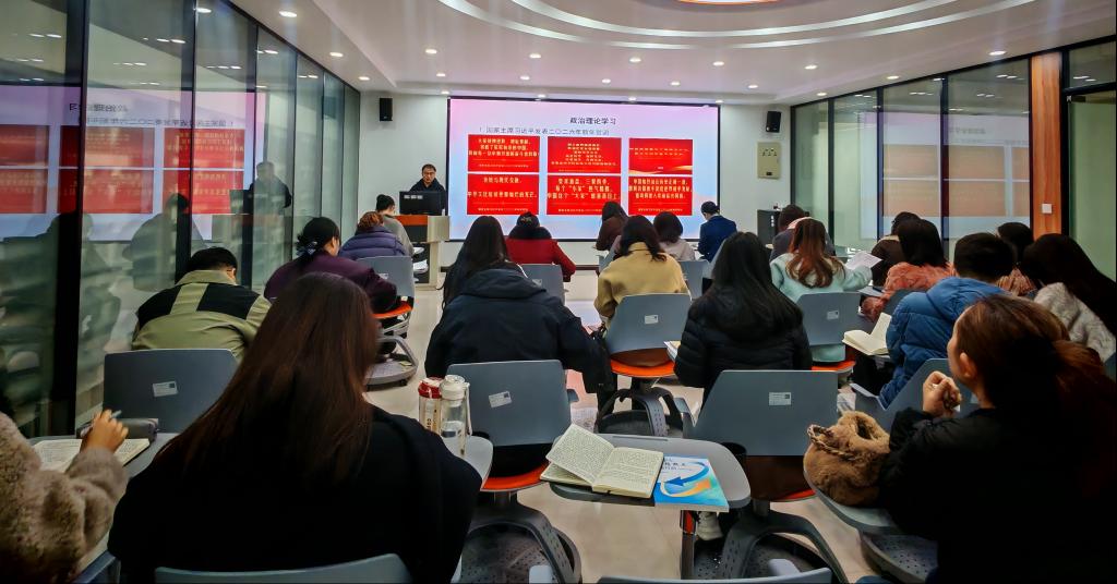 会上,集中学习了习近平总书记二〇二六年新年贺词、习近平总书记在二十届中央纪委五次全会上发表的重要讲话,学习了《求是》杂志发表习近平总书记重要文章;传达了2026年全国教育工作会议、新时代高校思政课建设工作推进会以及学校党委《关于认真开好2025年度党支部组织生活会和开展民主评议党员工作的通知》精神。